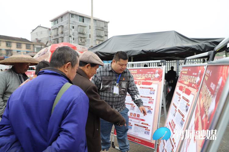 “唱支山歌给党听,我把党来比母亲……”崭新的芦坪市场内传来了嘹亮的歌声。黄金坳镇文化站工作人员唱起了《唱支山歌给党听》,吸引了四面八方的群众向他们靠拢,一起高声唱着红歌,歌颂党的伟大历史,品味红色传奇。同时,党员干部在集市内设置党史宣传点,向群众宣讲丰富有趣的党史知识,激发群众党史学习积极性。镇民政办、农机农技等站所还在现场向群众发放各类知识宣传册,服务群众,方便群众。