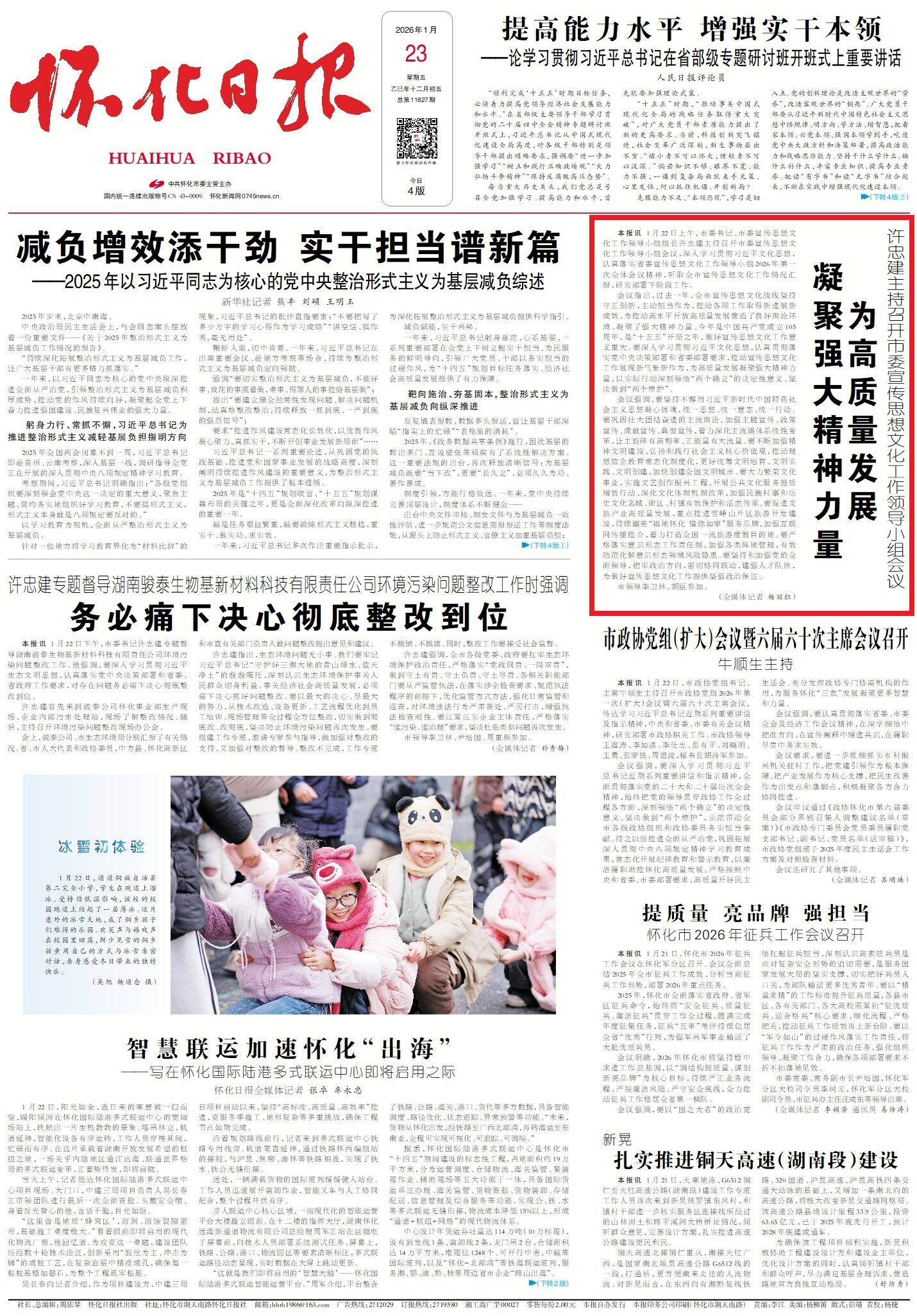 会议强调,要坚持不懈用习近平新时代中国特色社会主义思想凝心铸魂,统一思想、统一意志、统一行动。要巩固壮大团结奋进的主流舆论,加强主题宣传、政策宣传、成就宣传、典型宣传,着力深化主流媒体系统性变革,让主旋律有高频率、正能量有大流量。要不断加强精神文明建设,弘扬和践行社会主义核心价值观,推动理想信念教育常态化制度化,更好统筹文明培育、文明实践、文明创建,加快创建全国文明城市。要大力繁荣文化事业,实施文艺创作振兴工程,开展公共文化服务提质增效行动,深化文化体制机制改革,加强民族村寨和历史文化名城、街区、村镇有效保护和活态传承。要促进文旅产业高质量发展,重点推进雪峰山片区旅游开发建设,持续擦亮“福地怀化 懂你如家”服务品牌,加强互联网传播推介,着力打造全国一流旅游度假目的地。要严格落实意识形态工作责任制,加强各类阵地管理,有效防范化解意识形态领域风险隐患。要坚持和加强党的全面领导,把牢政治方向,密切协同联动,建强人才队伍,为做好宣传思想文化工作提供坚强政治保证。