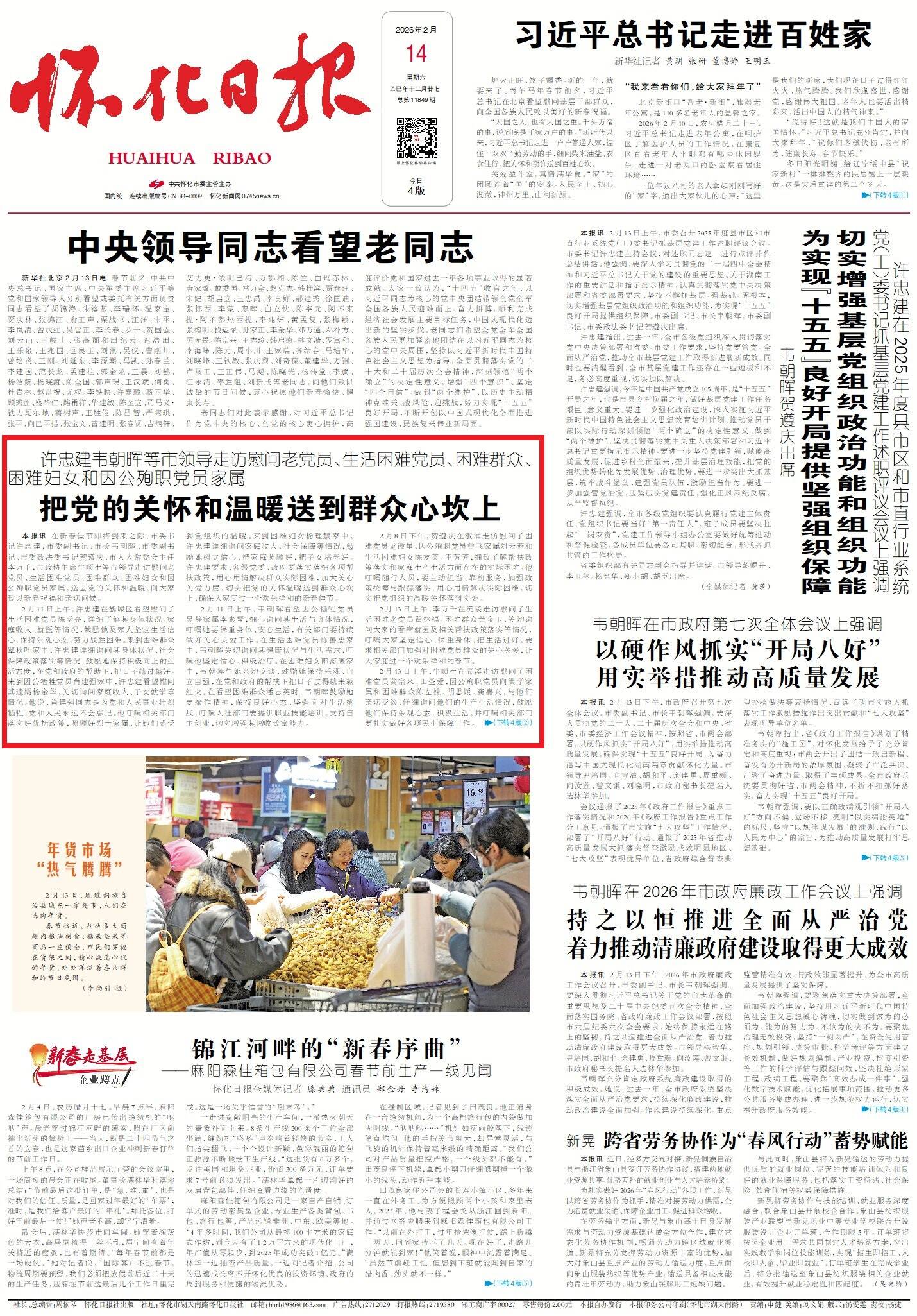 怀化日报全媒体讯在新春佳节即将来临之际,市委书记许忠建,市委副书记、市长韦朝晖,市委副书记、市委政法委书记贺遵庆,市人大常委会主任李万千,市政协主席牛顺生等市领导走访慰问老党员、生活困难党员、困难群众、困难妇女和因公殉职党员家属,送去党的关怀和温暖,向大家致以新春祝福和亲切问候。
