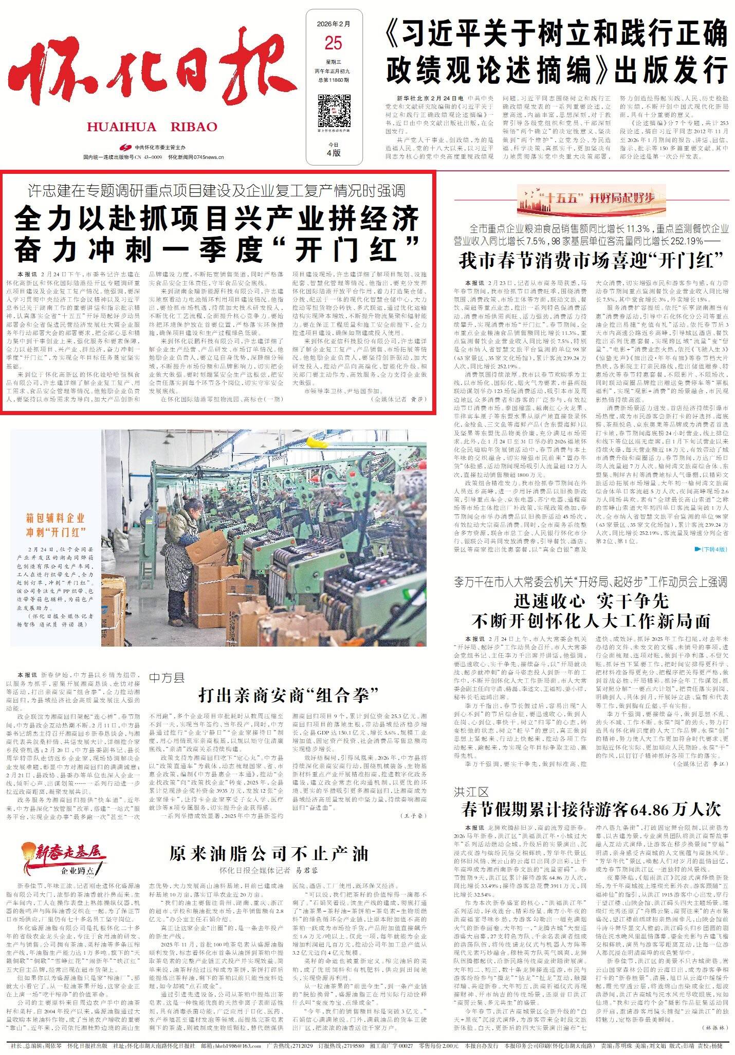 怀化日报全媒体讯2月24日下午,市委书记许忠建在怀化高新区和怀化国际陆港经开区专题调研重点项目建设及企业复工复产情况。他强调,要深入学习贯彻中央经济工作会议精神以及习近平总书记关于湖南工作的重要讲话和指示批示精神,认真落实全省“十五五”开好局起好步动员部署会和全省促进民营经济发展壮大暨企业服务年行动部署大会的部署要求,把全部心思和精力集中到干事创业上来,强化服务和要素保障,全力以赴抓项目、兴产业、拼经济,奋力冲刺一季度“开门红”,为实现全年目标任务奠定坚实基础。