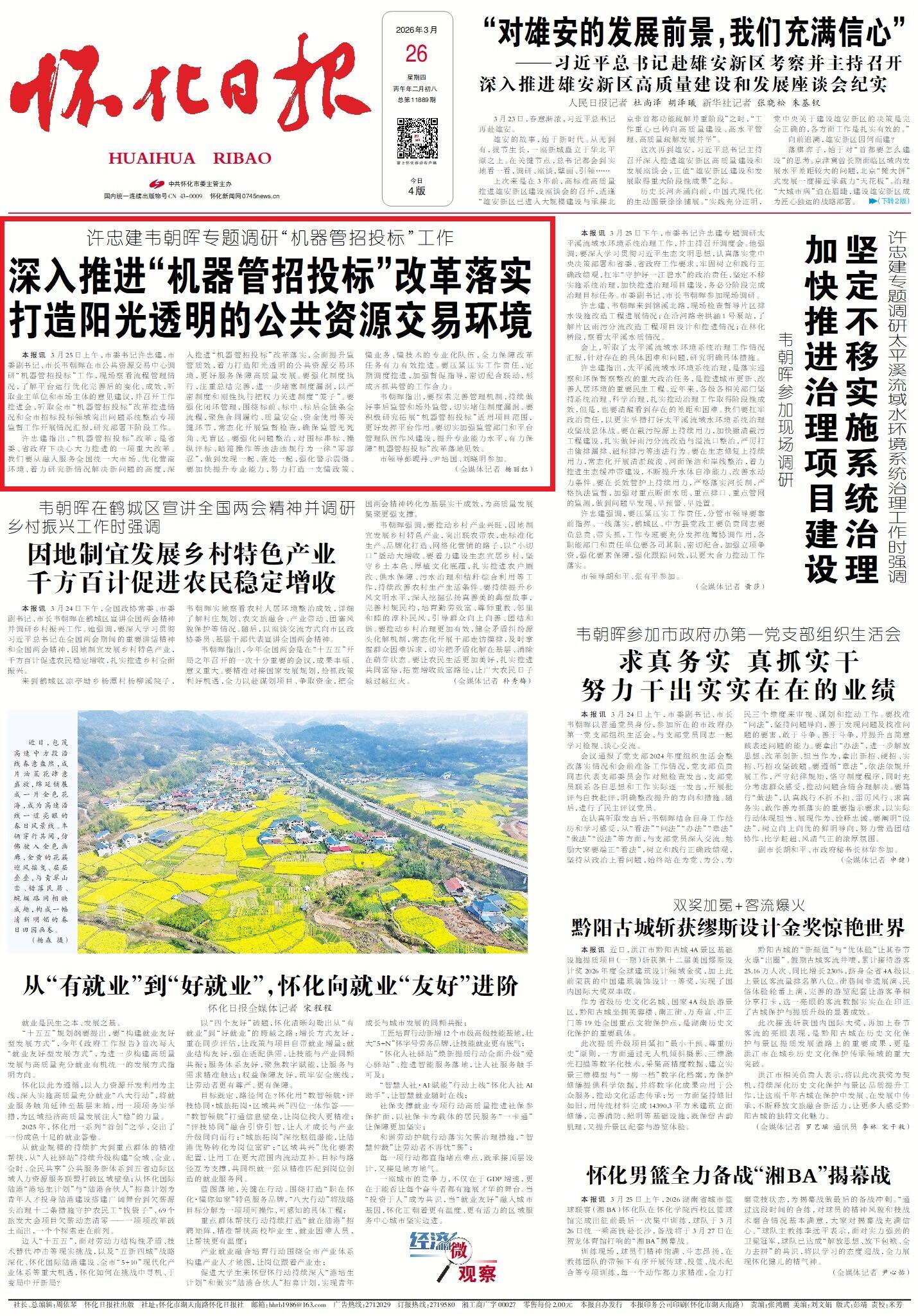 怀化日报全媒体讯3月25日上午,市委书记许忠建,市委副书记、市长韦朝晖在市公共资源交易中心调研“机器管招投标”工作,现场察看流程管理情况,了解平台运行优化完善后的变化、成效,听取业主单位和市场主体的意见建议,并召开工作推进会,听取全市“机器管招投标”改革推进情况和全市招标投标领域突出问题系统整治专项监督工作开展情况汇报,研究部署下阶段工作。