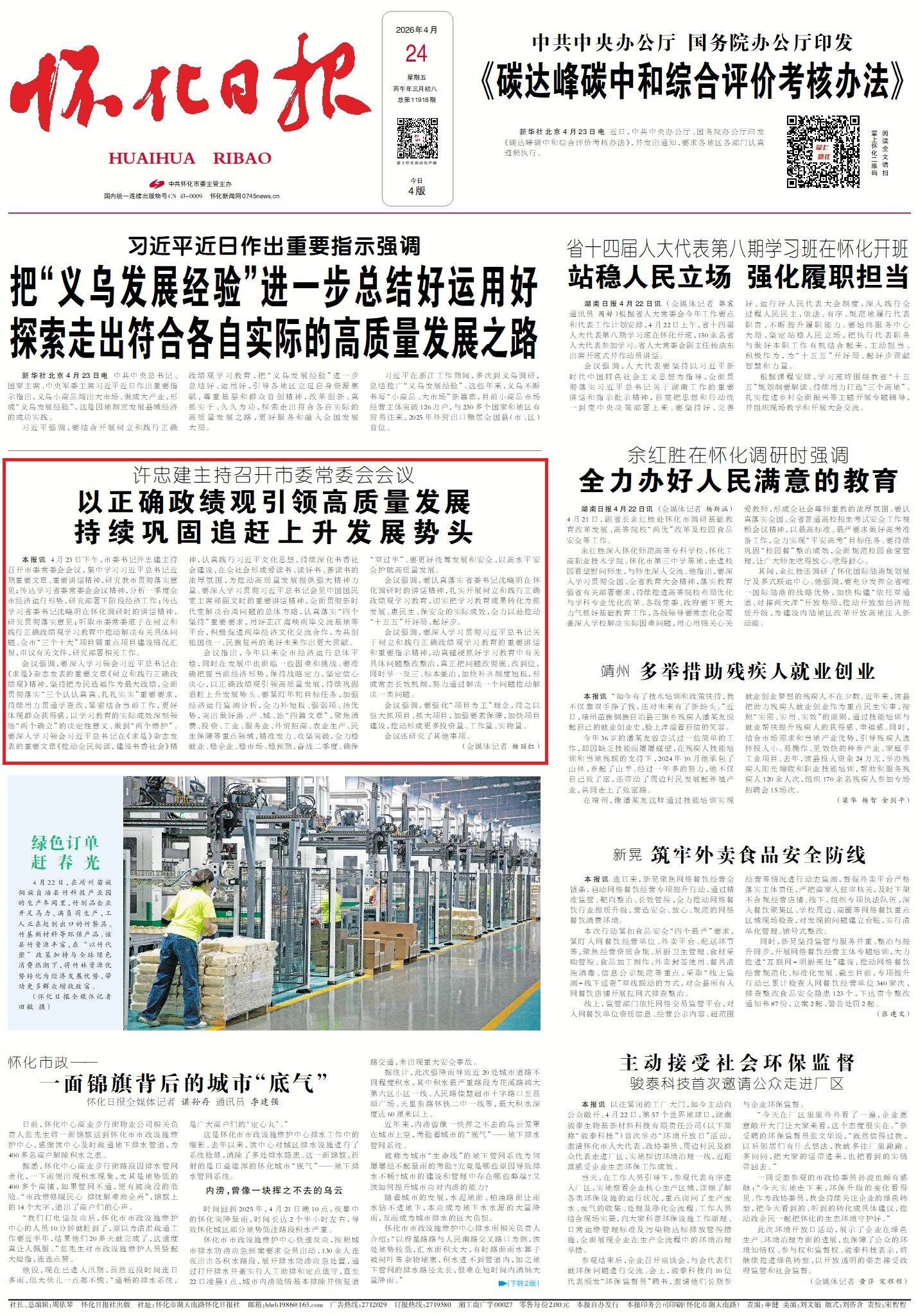 怀化日报全媒体讯4月23日下午,市委书记许忠建主持召开市委常委会会议,集中学习习近平总书记近期重要文章、重要讲话精神,研究我市贯彻落实意见;传达学习省委常委会会议精神,分析一季度全市经济运行形势,研究部署下阶段经济工作;传达学习省委书记沈晓明在怀化调研时的讲话精神,研究贯彻落实意见;听取市委常委班子在树立和践行正确政绩观学习教育中推动解决有关具体问题、全市“三个十大”项目暨重点项目建设情况汇报,审议有关文件,研究部署相关工作。