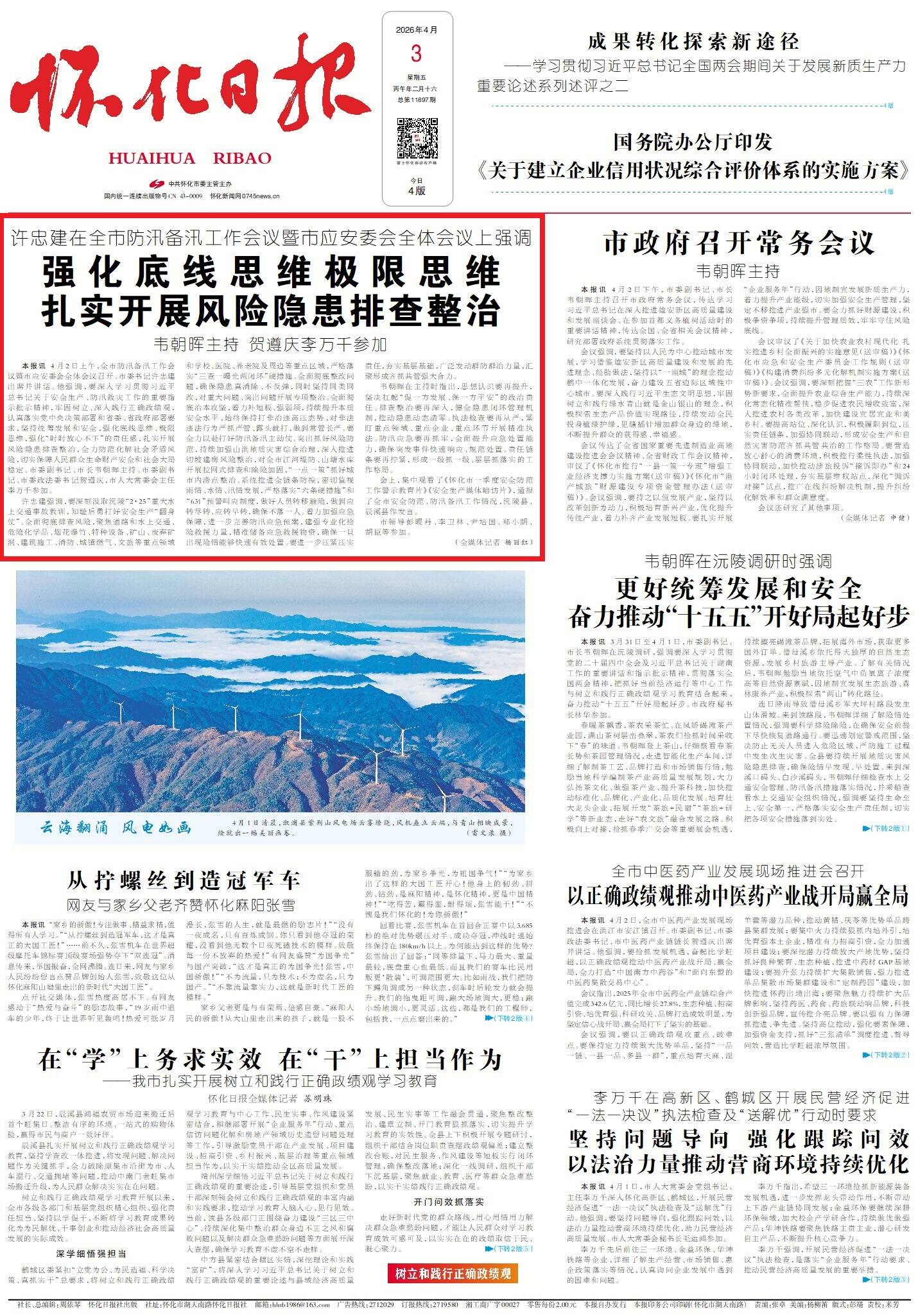 怀化日报全媒体讯4月2日上午,全市防汛备汛工作会议暨市应安委会全体会议召开。市委书记许忠建出席并讲话。他强调,要深入学习贯彻习近平总书记关于安全生产、防汛救灾工作的重要指示批示精神,牢固树立、深入践行正确政绩观,认真落实党中央决策部署和省委、省政府部署要求,坚持统筹发展和安全,强化底线思维、极限思维,强化“时时放心不下”的责任感,扎实开展风险隐患排查整治,全力防范化解社会矛盾风险,切实保障人民群众生命财产安全和社会大局稳定。市委副书记、市长韦朝晖主持。市委副书记、市委政法委书记贺遵庆,市人大常委会主任李万千参加。